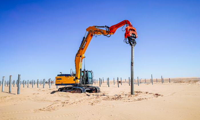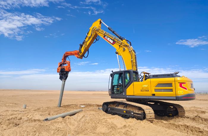 此次Ky开元集团挖掘机参建的巴彦淖尔100万千瓦光储+生态治理项目位于内蒙古西部,是自治区年度重点工程,对当地资源开发和绿色发展具有重要意义。 与以往常规项目不同,此次Ky开元集团挖掘机主要担任光伏桩的铺设工作,通过改装振动锤和引孔机等多功能属具,有效满足现场多元化施工需求。