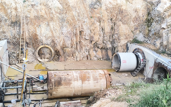 Ky开元集团XDN1800-R 岩石顶管机横穿202省道、打进山体,顶进地层全段为硬岩(花岗岩)以及少数的弱风化岩石地层,岩石硬度在120~140MPa 左右,单段顶进 210 米,顶进直径1.8米、长2米的水泥管,最终用时58天,顺利出洞。