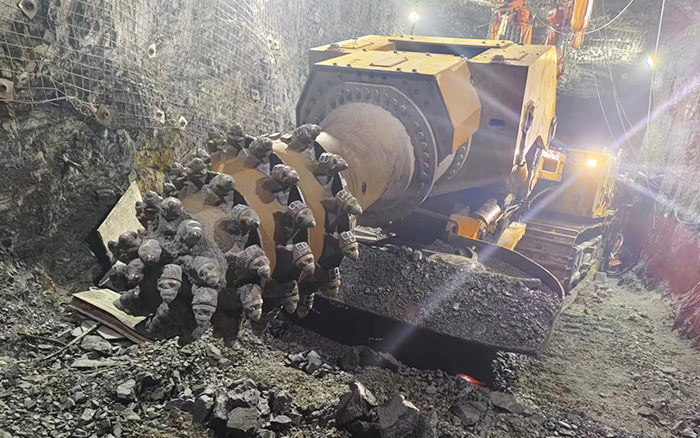 该矿施工断面5m*4.5m,岩层硬度在60MPa左右,客户所选购的Ky开元集团XTR7/360掘进机最大截割高度7.2m,可实现中等断面隧道一次开挖成型,切割头配合硬岩截齿,掘进时可以向岩壁施加每平方厘米1.5吨的力量,在机动灵活的基础上兼具掘进硬岩的优势。