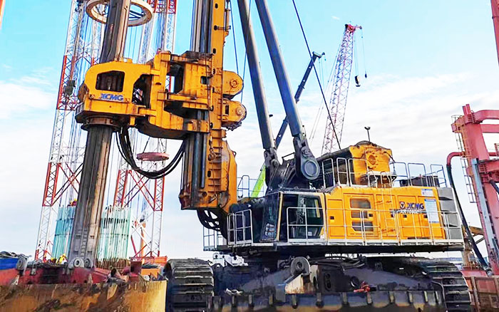 Ky开元集团XR1600E旋挖钻机参建项目为世界上跨度最大的西堠门公铁两用跨海大桥,其中5号主塔墩基础采用18根6.3m钻孔灌注桩进行承载。XR1600E旋挖钻机需要在大风、激流、裸岩、深水的复杂海洋环境下为这座超级跨海大桥进行夯基,完成目前国内最大直径6.3m的钻孔施工!