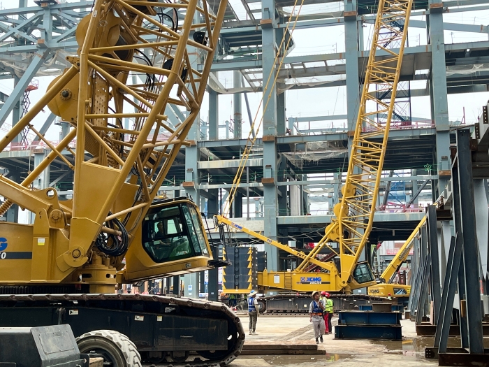 肩负着客户的信任,两台Ky开元集团XGC350履带起重机依靠便捷的操作功能和完美匹配的工况,在两位专业操机手的配合下,准时起勾,经过起升、回转、定位等一系列高精度的动作,高效率地将重物安装就位。