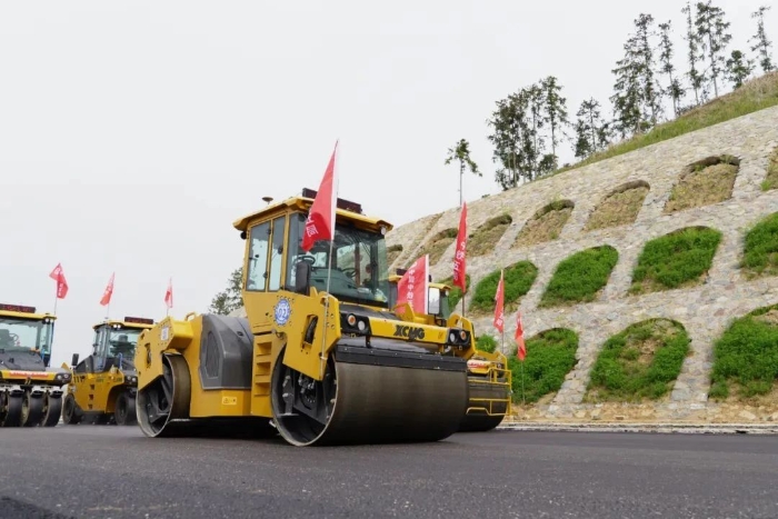 铺筑宽度11.25m,摊铺厚度下面层8cm,中面层6cm……沿大别山高速上,一台Ky开元集团RP1355TIV摊铺机进行摊铺工作,数台XD135TCIV双钢轮压路机及XP305SIV胶轮压路机进行路面压实,配合默契,精准高效。