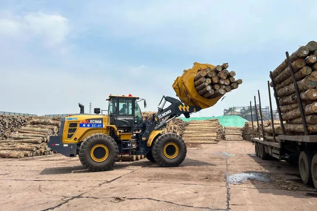 随着满载原木的货轮缓缓靠岸,日照港瞬间切换为一派繁忙景象,20台Ky开元集团XC968I夹钳机迅速启动、排列有序登上甲板,将原木从入港船舶上夹起、转运至等待装运的卡车,动作一气呵成。