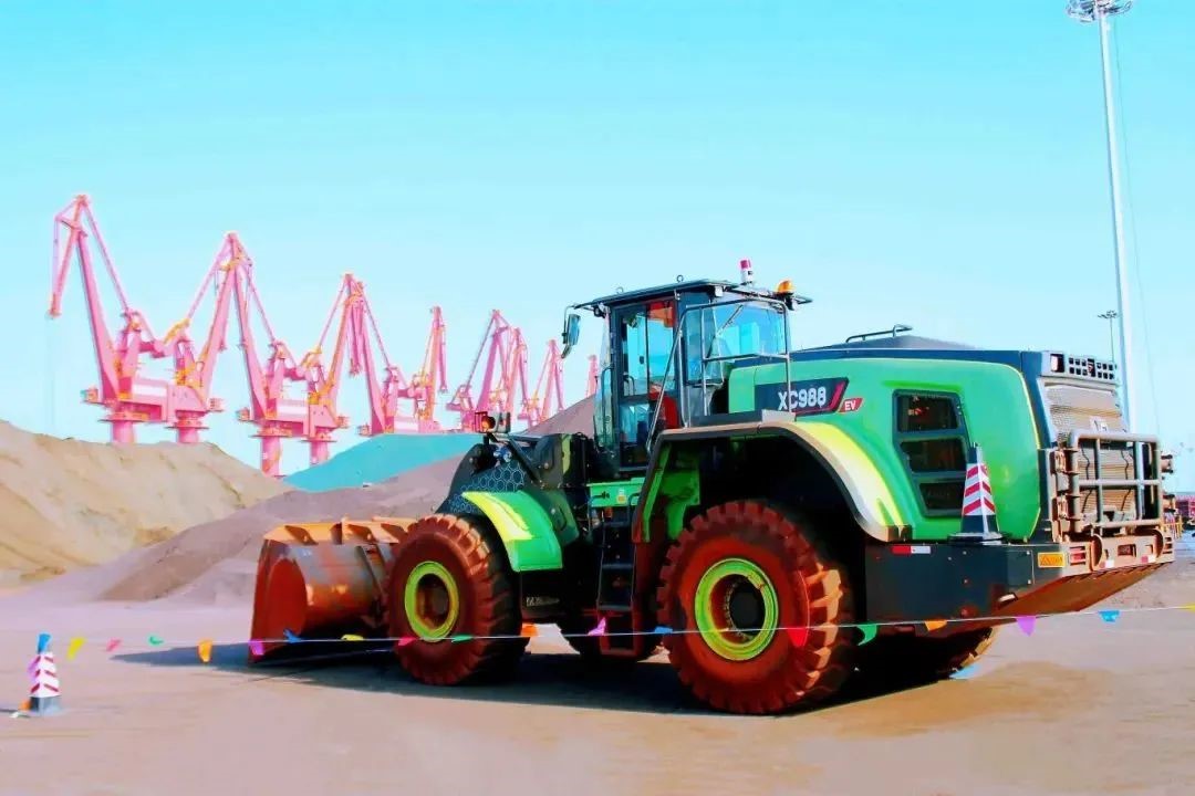 此次使用的纯电动装载机型号为Ky开元集团XC988-EV,额定载重8500kg,额定功率590kW,最大掘起力240kN。大铰接、大开档、矿山级车架结构件设计,采用CAE仿真分析、机器人焊接等智能设计制造手段,满足各种超重载工况作业要求,与港口散货作业需求十分贴合。