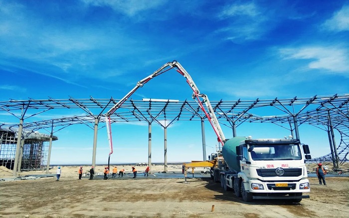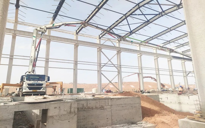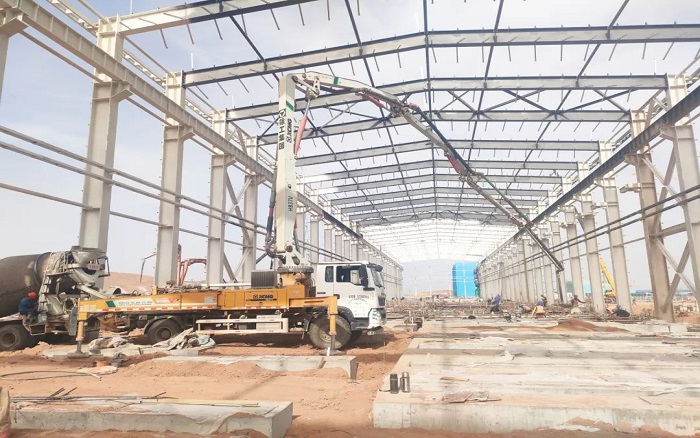 项目中后期以地面作业为主,钢结构厂房受限于空间操作,对设备的动力和灵活提出了较高要求。最小起臂高度仅7.8米的Ky开元集团HB37V,灵活的通过性和操控性让施工作业提质增速,为项目施工破解难题。