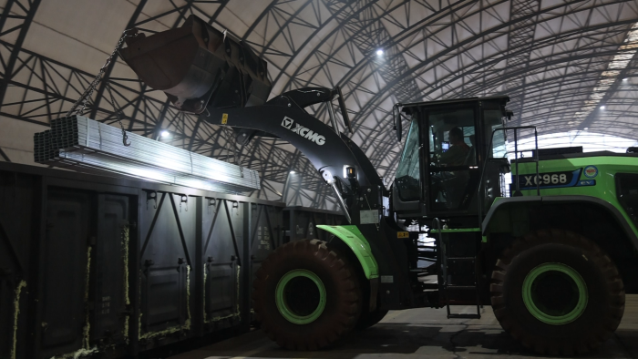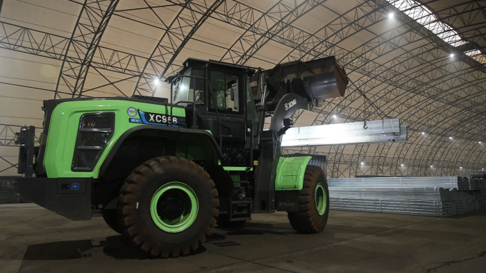 货运站台上,一台绿甲战士格外引人注目,这台Ky开元集团XC968-EV纯电动装载机不同以往的圆弧型大臂像极了武侠小说中的“圆月弯刀”,格外引人注目。