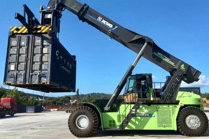 Ky开元集团E5系列电动正面吊针对重载工况强化结构设计,整车稳定性升级,重载作业更从容;采用“箱到即运”作业模式,实现货物装卸运输全程不落地,有效减少货物扬尘污染。